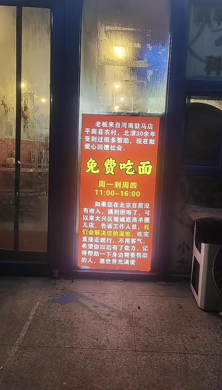 集目新闻记者 曹雪娇 “如果您目前在北京没有收入,遇到困难,可以到大兴区军城地尚阳泉儿店告诉工作人员,我们会帮助您解决吃穿问题。” 12月3日晚,北京网友拍摄的一家火锅店门口的心形灯牌走红。 4日晚,记者联系上该火锅店老板杨先生。他说,他和弟弟做“北漂”已经30多年了,过去得到过很多人的帮助,所以他们希望把这份爱心传递下去。该视频于12月3日晚发布。4日晚,视频拍摄者告诉积木新闻,自己是一名骑手并且不认识主人。他路过北京大兴区的这家店,被灯牌上的文字吸引,拍下了照片。记者注意到杨先生店门口的灯光指示牌(图片来源:视频截图)。火锅店门口的灯牌上的四个“免费面”大字中间非常显眼,下面是黄色小字,表示可以吃免费面的时间:“周一至周四”和“11:00-16:00”。此外,灯牌上还写着:“老板是河南驻马店平舆县农村人,三十多年来得到了北雕的很多帮助,现在带着一份——爱回报社会。” “如果您在北京没有收入,遇到困难,可以到店内大兴区军城下的上阳泉,告诉工作人员,我们会照顾您的衣食,吃完才走,不客气。”随后,记者联系上火锅店老板杨先生。他告诉记者,自己今年46岁,弟弟比他大两岁。两兄弟十几岁的时候就来到了“北京”。尤其是我的弟弟,只身来到北京打工两年,吃尽了苦头,也得到了很多好心人的帮助。今年6月,两兄弟在北京大兴区开了这家火爆的餐厅。哥哥提议做一个这样的灯箱,既能帮人,又能传递爱心。杨先生说,开业半年左右,只有两三个人来免费吃面。他们都是成年人了。其中两人从南方来到北京打工,却找不到工作。看到他们店的灯牌后,他在店门前走了好一会儿,最后被直接引到了店里。杨先生表示,店里主要卖火锅和面条,晚上和弗里达的时候顾客会比较多。整个周末。他们担心自己太忙,无法为顾客提供服务,所以决定定下周一至周四中午到下午的时间,可以免费吃面条。 “就是一碗面一碗饭,大家出门在外都过得不好。” (吉木新闻) 上一篇:实地考察|番茄大棚旁边有这样一个乡村苗圃
