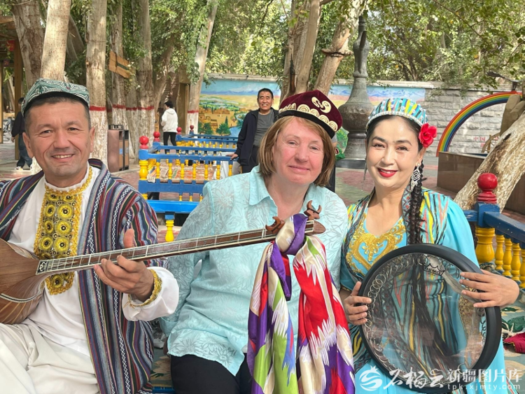 在10月的黄金秋季,新疆是一个有吸引力的景色,欢迎各个方向的游客。 10月3日,在Turpan Grape Valley风景秀丽的地区,澳大利亚80年历史的旅游麦地那(Medina)沉入了Mukam的柔和曲调,然后与导游公司Zulifia Aimati一起前往Urumqi。 这位80年历史的旅游麦地那(中间)在一个令人惊叹的地方与艺术家合影。 Zulifia Aimati的图片
